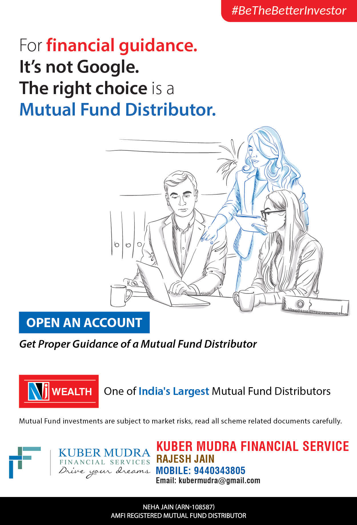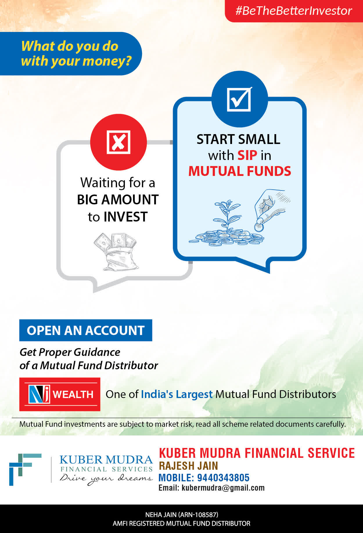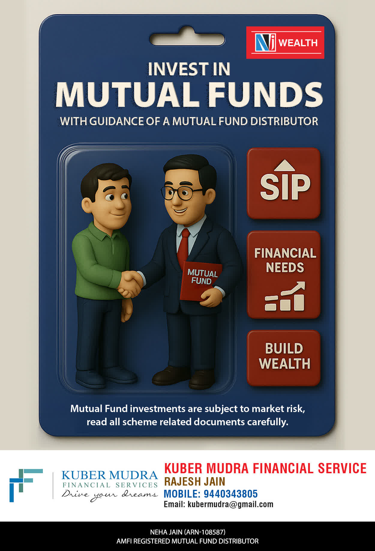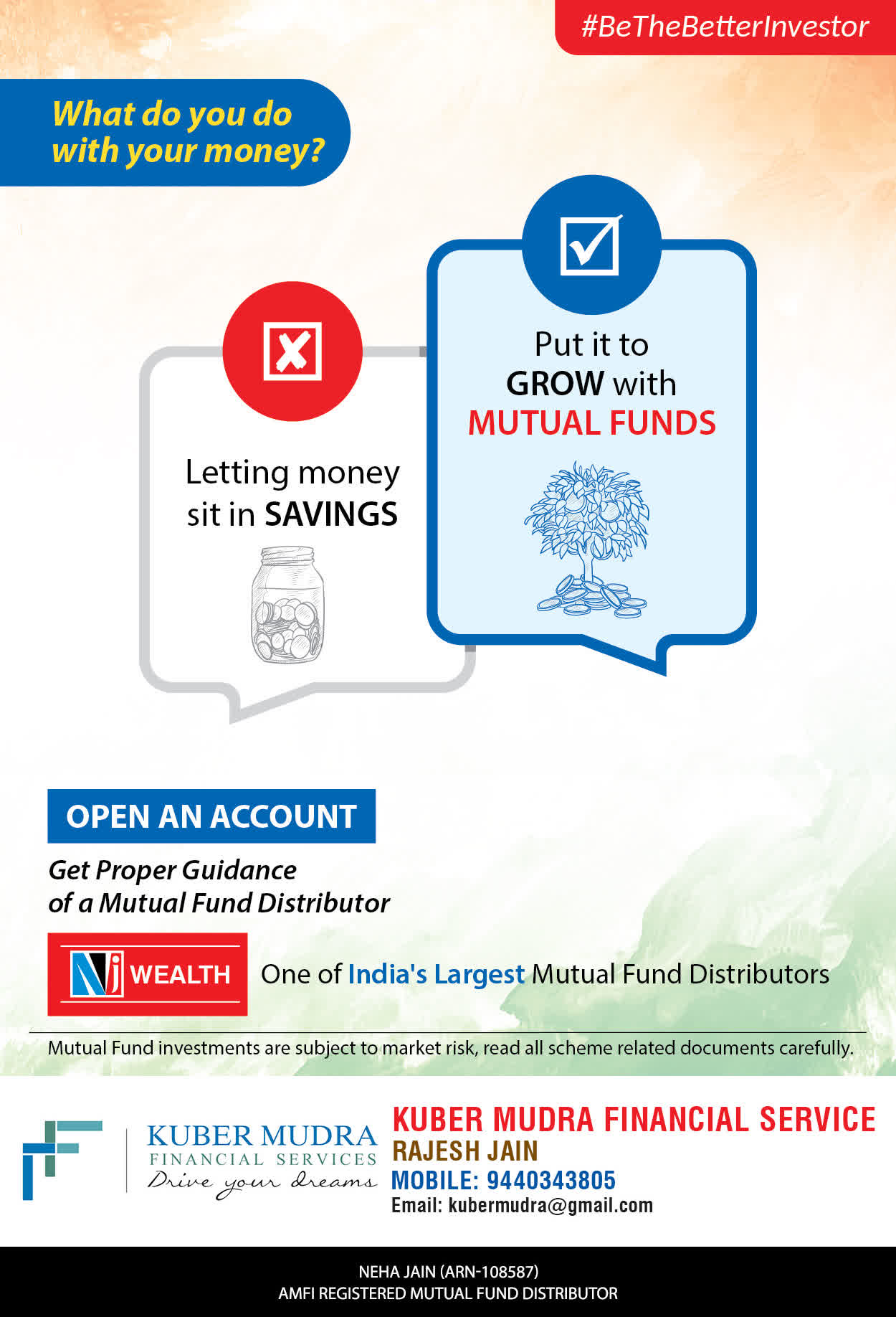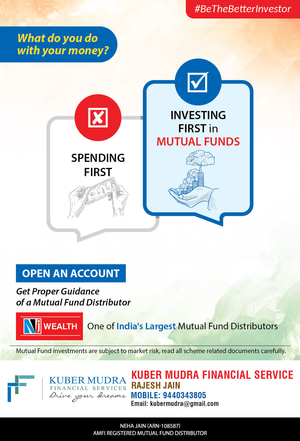 The Name KUBER MUDRA FINANCIAL SERVICES itself describes the very nature & goal we want to achieve for our Clients. Yes, our mission is to provide our clients with the best solutions in wealth creation and wealth management. We believe in first making our clients Financially literate. Earning after learning is the ultimate result. Our approach is to enable our client's to understand their investments, have knowledge of investment products and that they make proper progress towards achieving their financial goals in life.