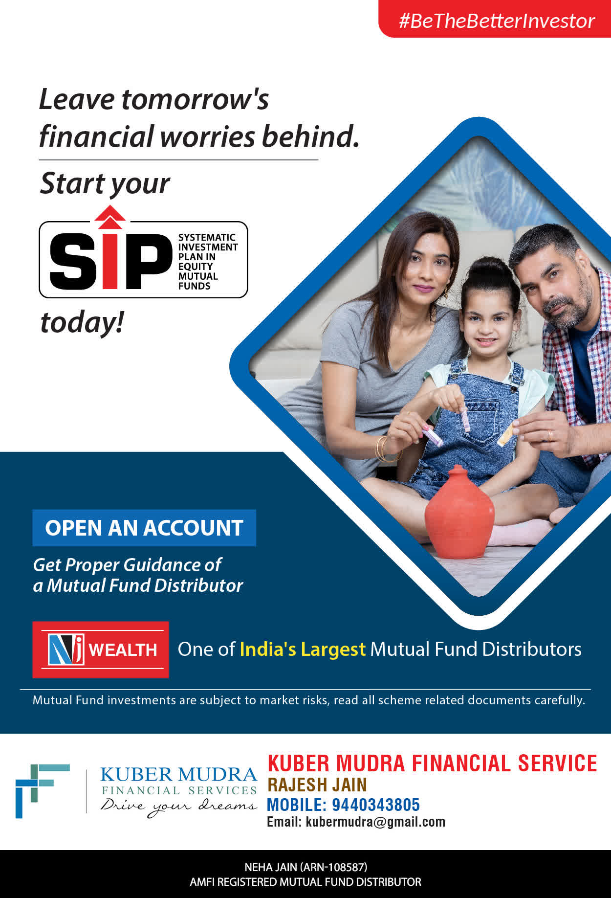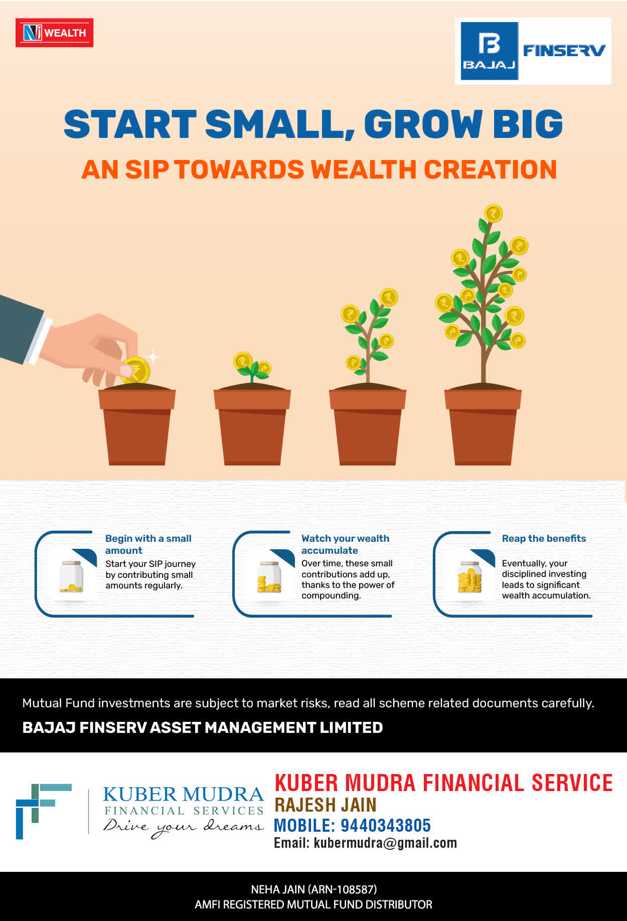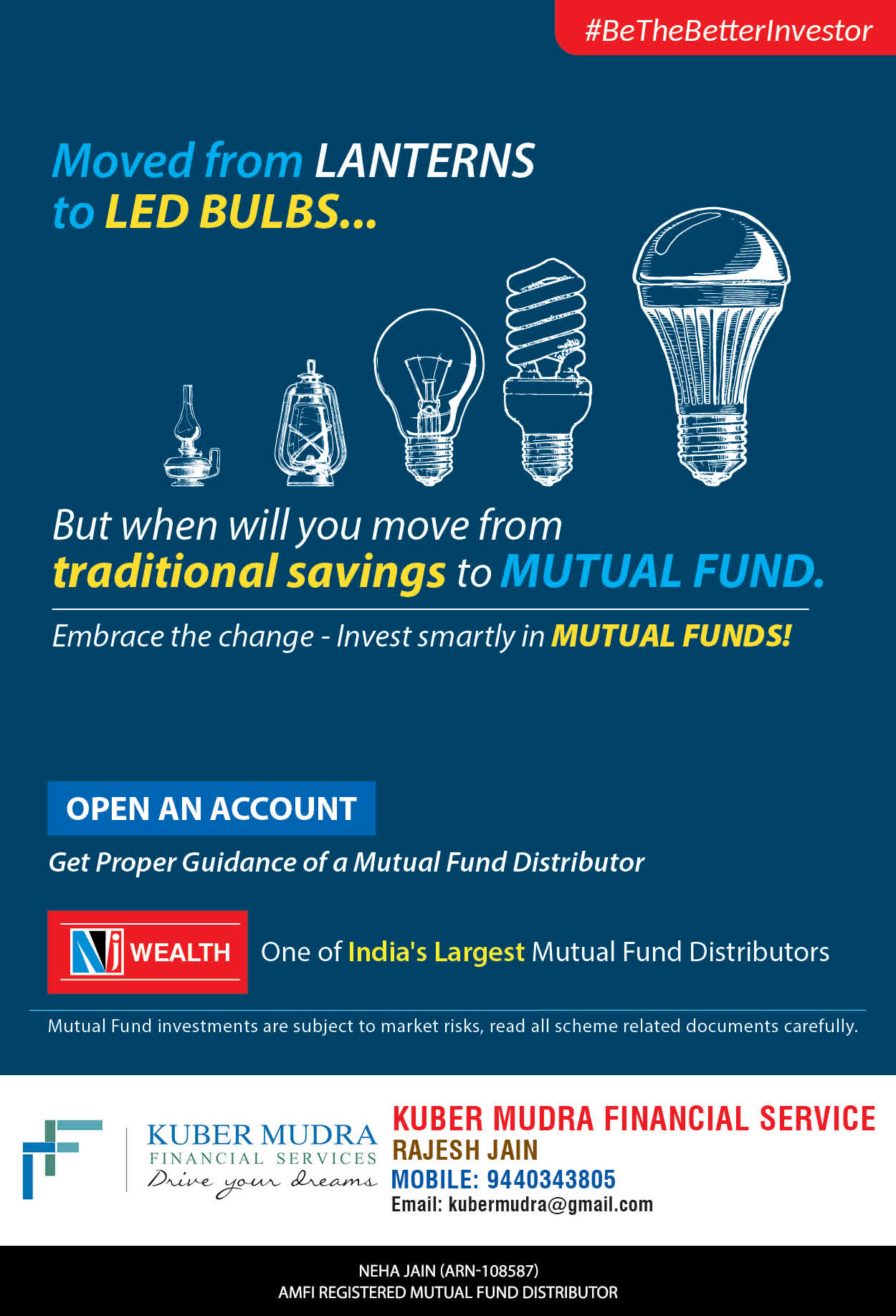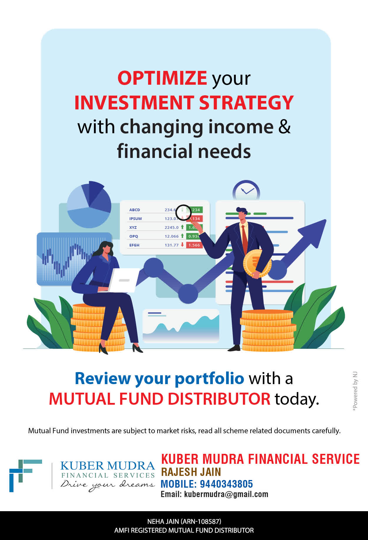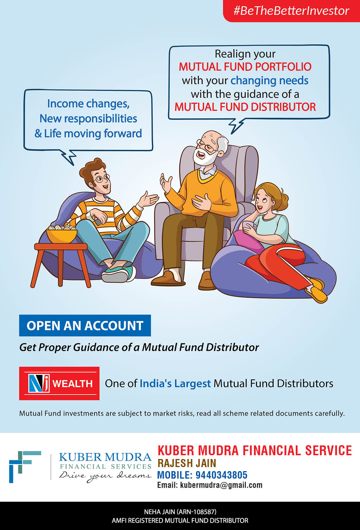 The Name KUBER MUDRA FINANCIAL SERVICES itself describes the very nature & goal we want to achieve for our Clients. Yes, our mission is to provide our clients with the best solutions in wealth creation and wealth management. We believe in first making our clients Financially literate. Earning after learning is the ultimate result. Our approach is to enable our client's to understand their investments, have knowledge of investment products and that they make proper progress towards achieving their financial goals in life.