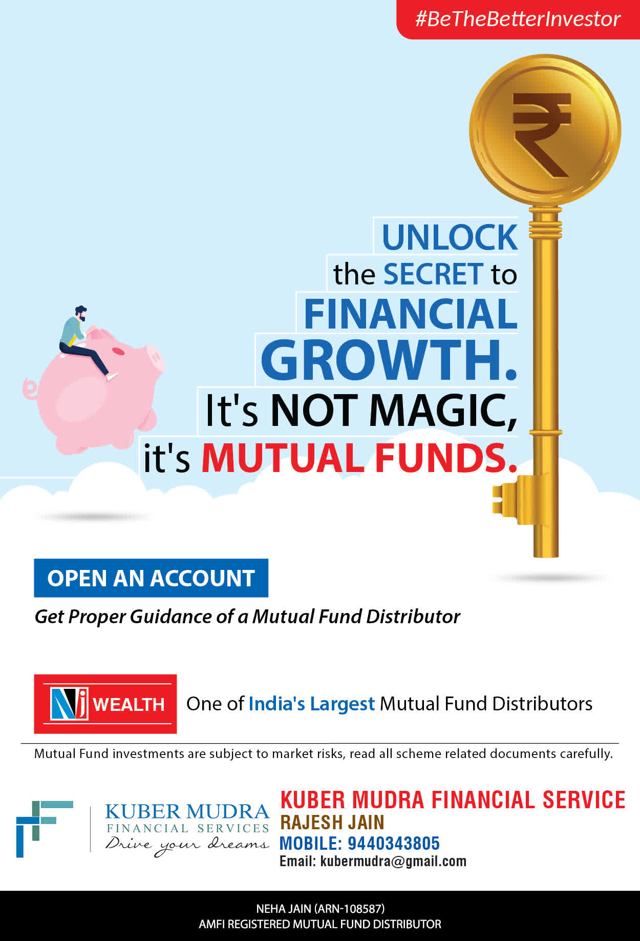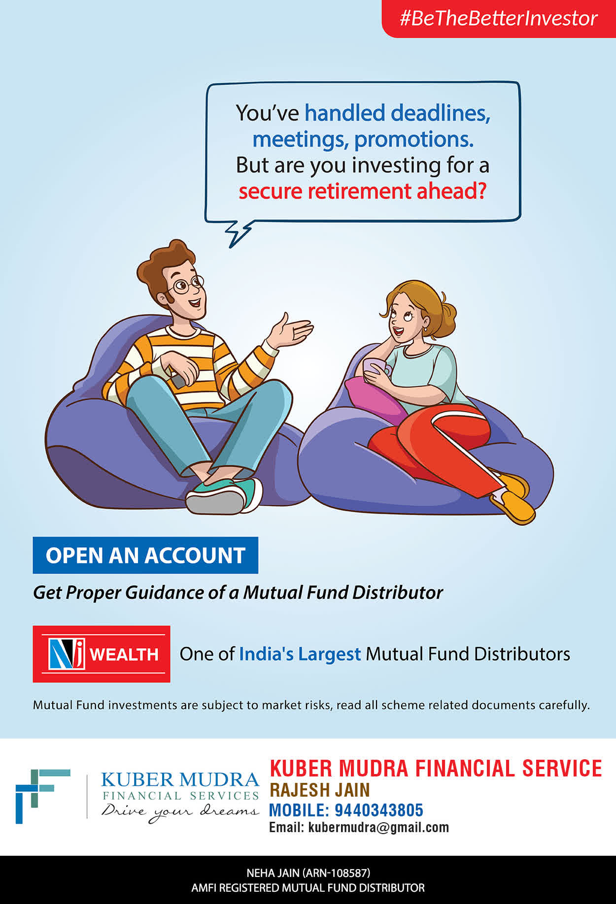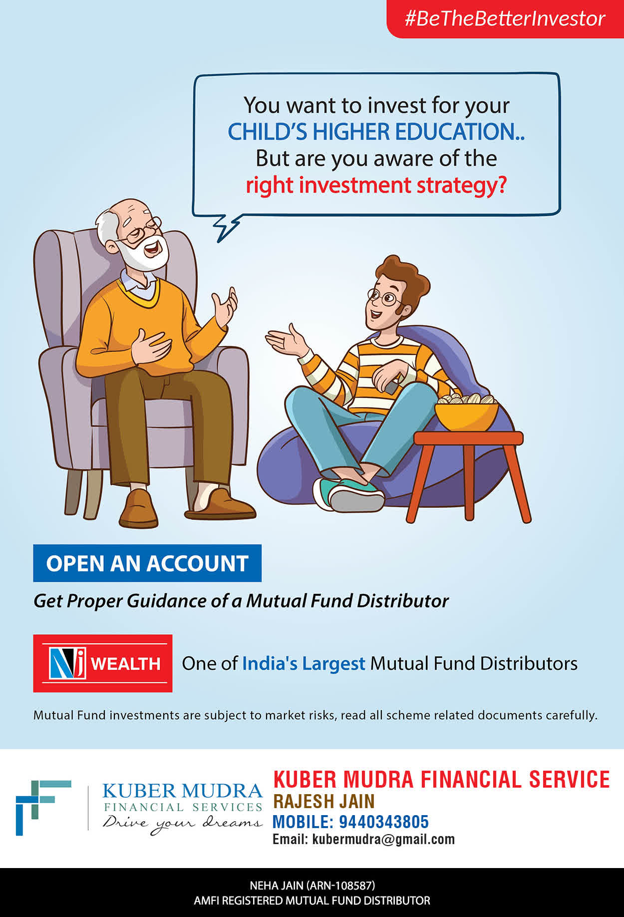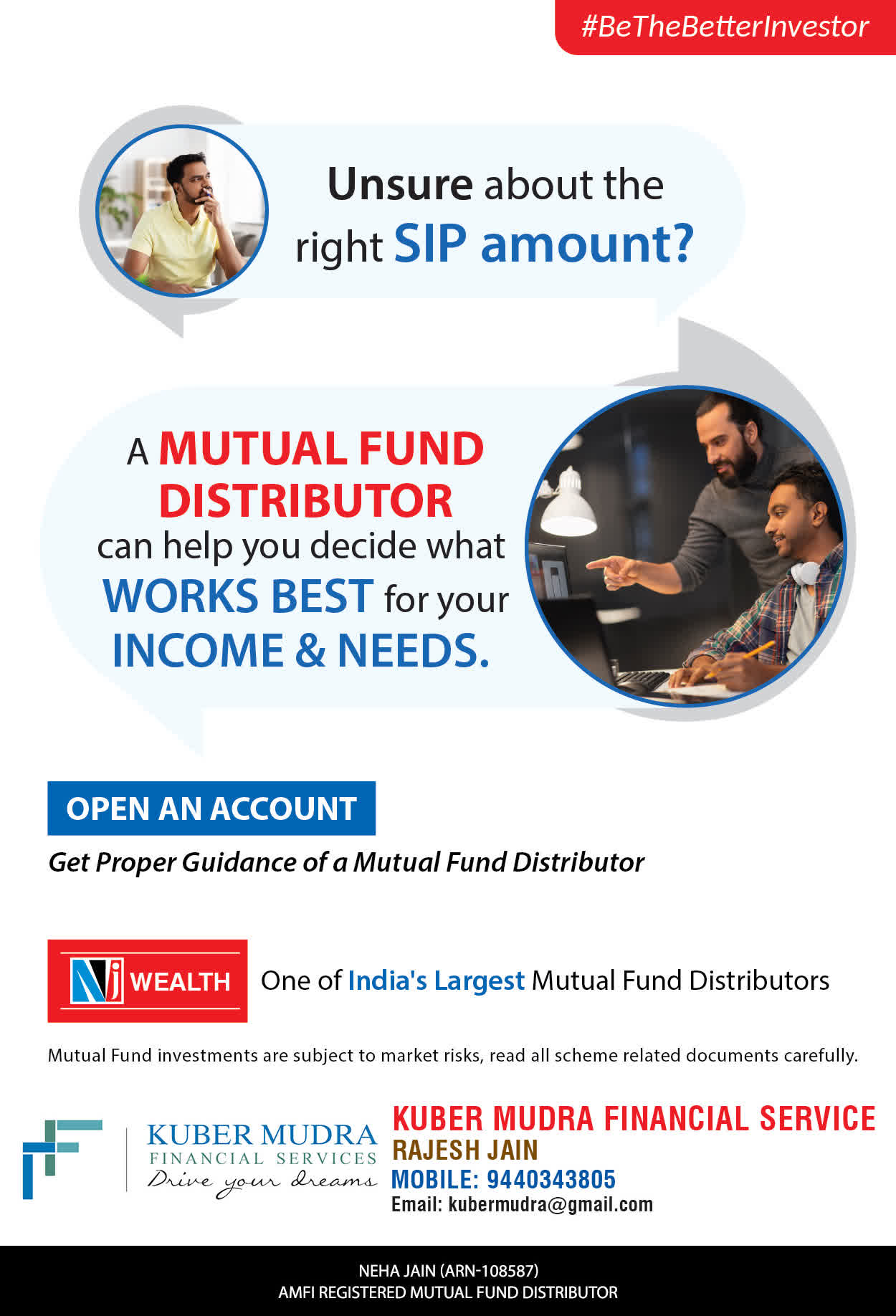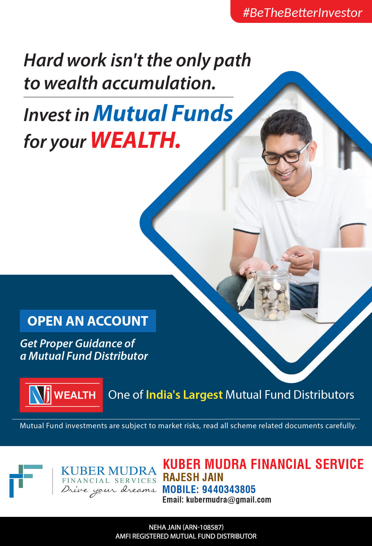The Name KUBER MUDRA FINANCIAL SERVICES itself describes the very nature & goal we want to achieve for our Clients. Yes, our mission is to provide our clients with the best solutions in wealth creation and wealth management. We believe in first making our clients Financially literate. Earning after learning is the ultimate result. Our approach is to enable our client's to understand their investments, have knowledge of investment products and that they make proper progress towards achieving their financial goals in life.